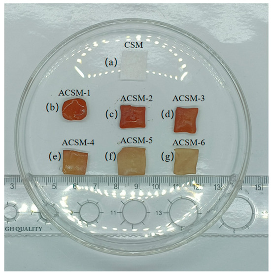 Figure 2 shows the macroscopic images of composite membranes under different parameters. The membrane of the CSM without AgNO3 and ultrasound treatment was white, soft, and thin. The color of the ACSM membranes after ultrasonic treatment in a precursor solution was deepened, orange or brown, elastic, and slightly curled at the edges. The change in membrane color was due to the surface plasmon resonance (SPR) of AgNPs, and the slight difference in membrane color at different parameters was due to the content and size of AgNPs [29].