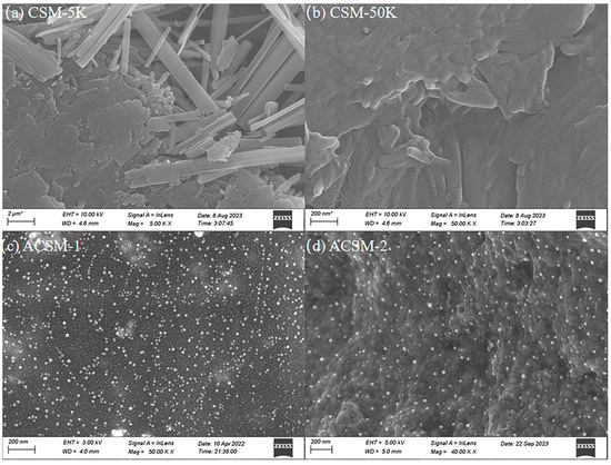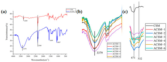 As shown in Figure 5a, the characteristic peaks of the CSM membrane at 3309 cm−1 are related to the stretching vibration of the -OH group, and at 2360 cm−1 are related to the vibration of the -C=O- group. The characteristic peaks of the ACSM membrane at 3379 cm−1 are related to the stretching vibration of the -OH group, at 2360 cm−1 related to the vibration of the -C=O- group, and at 1604 cm−1 related to the asymmetric stretching vibration of the -COO group in carboxylates. The characteristic peak at 2360 cm−1 is the vibration of the -C=O- group, the characteristic peak at 1604 cm−1 is related to the asymmetric stretching vibration of the -COO group in carboxylate, and the characteristic peak at 1087 cm−1 is related to the stretching vibration of the C-O-C group. As shown in Figure 5b, the transmittance at the -OH peak is different, indicating that the number of -OH functional groups in the membrane is different. Higher transmittance indicates a higher number of -OH groups, which enhances the ability to form hydrogen bonds and allows for increased intermolecular interactions. As shown in Figure 5c, both CSM and ACSM membranes showed a characteristic peak at 671 cm−1, and the ACSM membrane showed a characteristic peak at 532 cm−1, indicating the appearance of C-O-Me bonds.