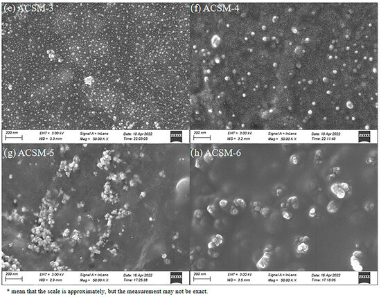 SEM images of as-prepared ACSM composite membranes are shown in Figure 3. At 5K magnification, the CSM membrane has a layered structure of modified carboxymethyl cellulose on the left side of the surface and many long fibers on the right side (Figure 3a). When the magnification is up to 50 K, its surface is a layered structure of modified cellulose (Figure 3b). As shown in Figure 3c–e, the Ag NPs were uniformly and densely distributed on the membrane surface as the sonication time increased from 15 to 45 min. When the time increased to 60 min, Ag NPs were sparsely distributed (Figure 3f). From Figure 3f–h, the Ag NPs on the surface distributed unevenly and easily agglomerated when the reducing agent content was low. When the reducing agent content increased to 10 g, the Ag NPs were distributed tightly and uniformly with less reunion (Figure 3e).