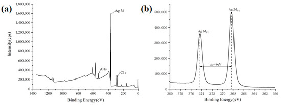 XPS spectra of the ACSM composite membrane are shown in Figure 4. From Figure 4a, the ACSM composite membrane mainly contains carbon, oxygen, and silver elements. As shown in Figure 4b, the characteristic peaks of Ag 3d consisted of the twin peaks of Ag 3d5/2 at 368.28 eV and Ag 3d3/2 at 374.28 eV; the difference in binding energy between the two characteristic peaks was 6 eV, which confirmed that the elemental Ag existed in the form of elemental silver in the prepared ACSM films. The binding energies of both Ag 3d5/2 and Ag 3d3/2 of the prepared ACSM membranes were lower than those of standard monolithic silver, which was mainly due to the interaction between Ag NPs and CMC/SR/MBA [30].