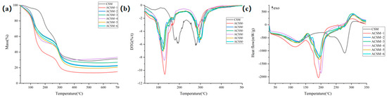 (a) TG diagram of CSM membrane and ACSM membranes; (b) DTG diagram of CSM membrane and ACSM membranes; (c) DSC diagram of CSM membrane and ACSM membranes.