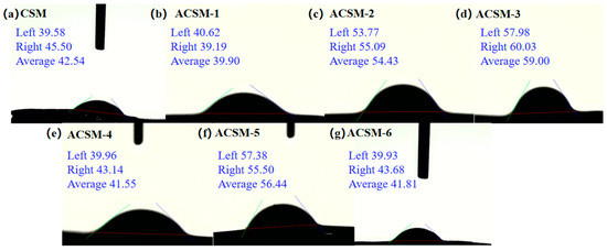 Water contact angle diagram of CSM membrane and ACSM membranes: (a) CSM membrane; (b) ACSM-1 (US-15 min, EG-10 g); (c) ACSM-2 (US-30 min, EG-10 g); (d) ACSM-3 (US-45 min, EG-10 g); (e) ACSM-4 (US-60 min, EG-10 g); (f) ACSM-5 (US-45 min, EG-8.5 g); (g) ACSM-6 (US-45 min, EG-7 g).