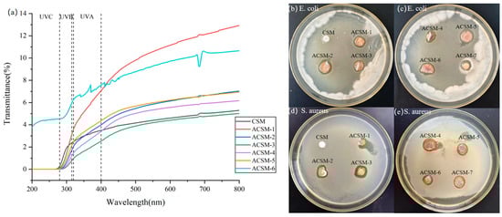 (a) Light transmittance of CSM membrane and ACSM membranes; (b–e) circle of inhibition of prepared ACSM membranes against E. coli and S. aureus.