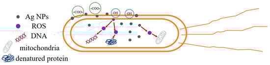 As shown in Figure 9, the inhibitory mechanism of Ag NPs is as follows: when Ag NPs are produced and attached to the surface of the bacterial cell membrane, they can interfere with the permeability and respiratory function of the cell; moreover, Ag NPs can enter into the bacteria to disrupt their normal physiological activities and metabolism, and even destroy their bacterial structure, thus inhibiting the bacteria to achieve the antimicrobial effect [33]. In addition, compared with S. aureus, ACSM membranes have higher antibacterial activity against E. coli. It may be because the outer membrane of E. coli is rich in polysaccharides, phospholipids, and proteins, etc. The -COO- and -OH groups in the ACSM membranes can interact with these outer membranes, facilitating the entry of Ag NPs into the outer membrane to destroy E. coli cells.