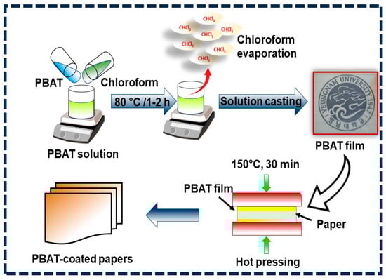 Prior to use, the PBAT pellets had been dried in an oven at 60 °C for 24 h. Solution mixing and drop-casting were used in the fabrication of the PBAT [35,36,37,38,39]. In chloroform, 2.0 g of PBAT was dissolved. The stirred solutions were then transferred onto a glass plate after 12 h and sonicated for 30 min to form a PBAT film. The solvent was permitted to air out for a further 48 h at room temperature so as to measure its characteristics. The process to fabricate coated paper utilizing PBAT film is shown in Figure 1. To produce the paper coating, two 2 × 2 cm2 PBAT film were coated on the top and bottom of the paper. After that, the sample was heated to 150 °C for 15 min in a laboratory hydraulic heating press (UL Chemical, Seoul, Republic of Korea; Model ULC-HP 400M).