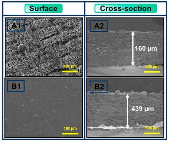SEM images of the surface and cross-section of (A1,A2) paper and (B1,B2) PBAT-coated paper material.
