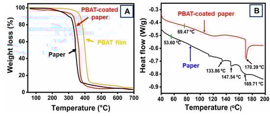 (A) TGA curve and (B) DSC curves of paper and PBAT-coated paper. The TGA curve of PBAT film insert (A).
