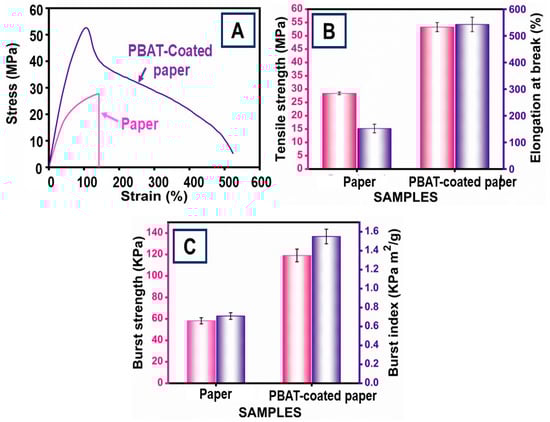 (A) Stress–strain curves; (B) tensile strength and elongation at break; (C) burst strength and burst index values of paper and PBAT-coated paper: The error bars show ± 5.00 standard errors.