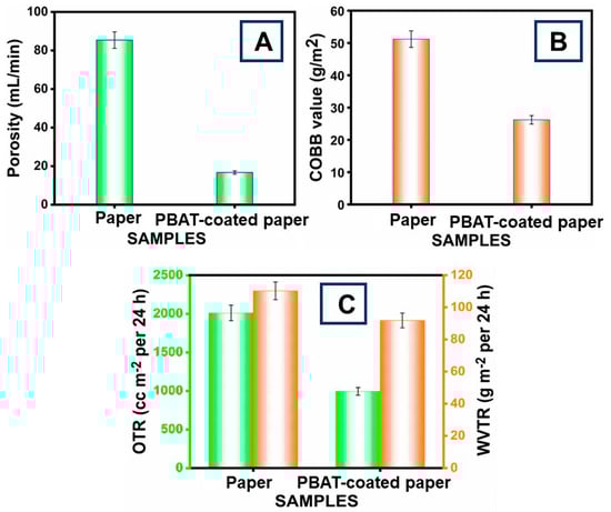 (A) Paper porosity values decreased with PBAT coating; (B) water absorption values reduce as PBAT film coated the paper; (C) barrier properties of PBAT-coated and uncoated paper material. The error bars show ±5.00 standard errors.