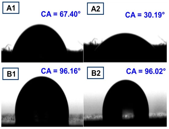 Images of water contact angle after 1 s and 120 s of the papers (A1,A2) and PBAT-coated paper (B1,B2).