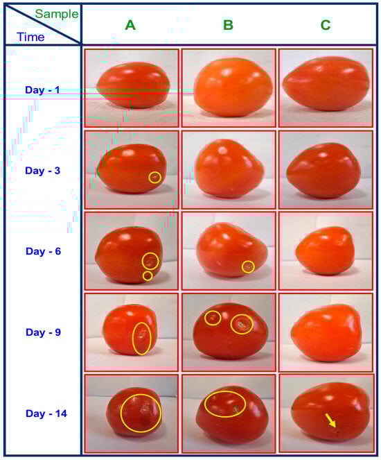 The appearance of the tomatoes covered with (A) control (open air), (B) uncoated paper, and (C) paper coated with PBAT film during storage at room temperature.