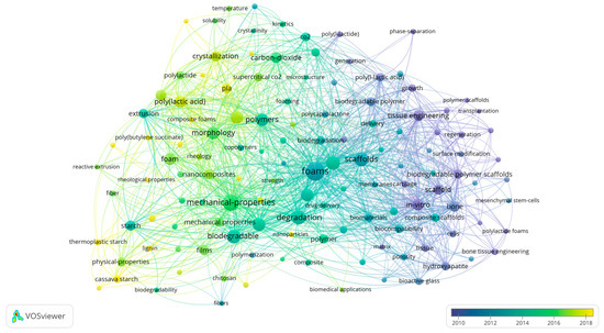 In the last decade (green and yellow colours), studies involving foams or foaming have focused on the main biodegradable polymers and their mixtures or composites and their characterization in terms of mechanical properties, morphology, crystallization, rheology, and biodegradability aspects. Reinforcing agents such as cellulose, lignin, fibres, chitosan, and nanoparticles are also considered to improve the foam properties. Moreover, the use of non-conventional technologies, such as supercritical CO2 for foaming and reactive extrusion, are also highly mentioned. Regarding the polymer matrices, PLA has a higher prevalence in the more recently published research studies and is followed by starch, poly(butylene succinate) (PBS), PCL, its blends, and its composite foams.