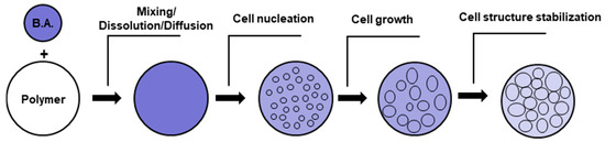 Main steps of polymeric foaming process. BA stands for blowing agent, which could be gas (PBAs) or some compound that could release gas during foaming (CBAs).