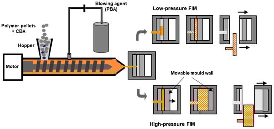 Like foaming extrusion, foam injection moulding (FIM) is a variant of the conventional injection moulding process. The main differences are the use of a blowing agent and some additional equipment features such as a special nozzle. As in the case of extrusion foaming, the blowing agent can be added jointly with the polymer pellets through the hopper (in the case of CBAs) or directly injected into the molten polymer in the barrel. The screw pushes the gas/polymer mixture along the barrel and injects it into the mould. The foaming process within the mould can occur by two different processes that differ mainly in the pressure inside the mould cavity (see Figure 4). In the case of low-pressure FIM, the mould is just partially filled with the gas/polymer melted mixture, which triggers a sudden drop in the pressure to which the mixture is subjected. This leads to immediate foaming, causing the polymer to expand and occupy the entire mould cavity. In the other variant, so called high-pressure FIM, the mould is first pressurized and then the melt is injected at high pressure into the mould to fill the entire cavity. Afterwards, the mould is partially opened, causing an increase in the mould volume and a drop in the pressure, which triggers, in this way, the foaming and the expansion of the injected molten polymer.
