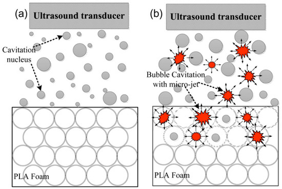 The technique is based on the application of instantaneous energy generated by acoustic vibration, micro-jet, and ultrasonic cavitation to increase the permeability between the closed cells of the polymer foam. The foam is dipped in water and when the foam micro-bubbles are excited by the power ultrasound, they vibrate and can further expand, shrink, or collapse. During the cavitation process, the collapse of the bubbles/cells generates high temperatures and pressures in a very confined space that are sufficient to break the cell walls. This process is enhanced by the micro-jet-induced current shot at high velocity that promotes further cell rupture (see Figure 7) [159]. The ultrasonic step can be applied either at the beginning or after the cell nucleation, and depending on that, cell morphology is greatly affected. If the ultrasonic step is applied at the beginning of the cell nucleation, the ultrasonication leads to the nucleation of a large number of small cells resulting in a higher cell density. On the other hand, if the ultrasonic step takes place after cell nucleation and growth, the ultrasonication results in cell wall rupture, yielding a more open cell structure and interconnected cells [160].