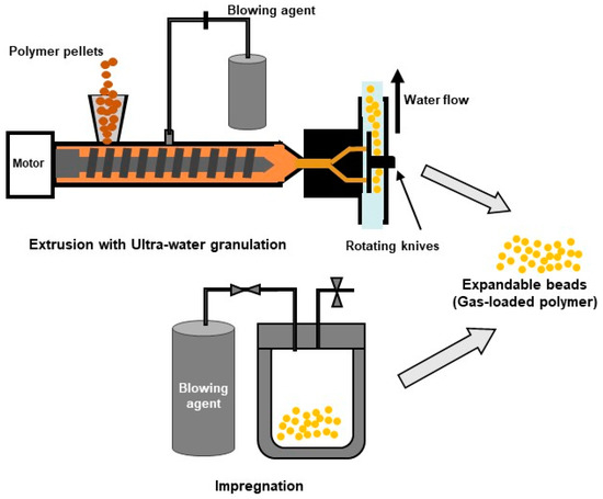 Another route to obtain expandable beads uses extrusion combined with underwater granulation [194,195]. The melt mixture of the polymer and blowing agent is extruded into a pressurized water chamber and granulated by rotating knives. Foaming during extrusion is prevented by maintaining the water pressure above the vapour pressure of the blowing agent, in this way trapping the blowing agent within the solidifying polymer during cooling. The gas-loaded expandable beads are subsequently pre-foamed at low pressure by hot vapour, triggering cell nucleation and further growth and allowing for the release of the trapped gas, yielding low-density expanded beads at the end. This method presents several advantages compared to the impregnation method such as the dosing of the blowing agent and additives into the melt and the fact that it is a continuous method [38,58]. Figure 10 illustrates the methods mentioned in this review for producing expandable beads.