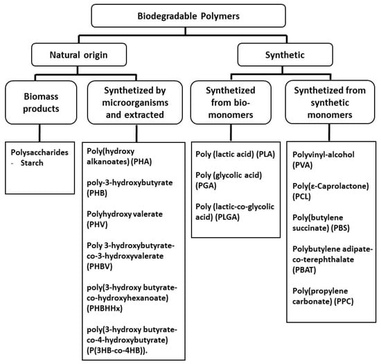 Equally important has been the focus on the polymer’s biodegradability, that is, its degradation by natural processes after use, normally by the action of naturally occurring microorganisms, avoiding the accumulation of plastics in landfills for many years [30]. Thus, biopolymers provide improved circularity and a lower carbon footprint by using renewable resources and biodegradation as an alternative end-of-life option besides adequate material properties with a view to practical application [28]. Some published review manuscripts discuss the shift in focus from polymers of petrochemical origin to the use of polymers of biological origin and the importance that biodegradability has on the environment [27,31,32].