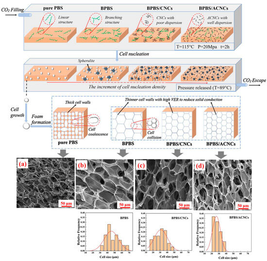 Several strategies can be used to improve the properties of polymers during batch foaming. Yan et al. [2] introduced stereo-complex crystallites as an effective modifier to reinforce PLA and improve the cellular morphology, cell uniformity, and increase the expansion ratio at high foaming temperatures. The followed methodology enabled the fabrication of high-expansion PLA foams with improved thermal insulation and compressive performance. Dreier et al. [147] used reactive extrusion on a twin-screw extruder to modify PLA with dicumyl peroxide as a melt strength enhancer and polycarbodiimide as a hydrolysis stabilizer, in order to protect PLA against thermal degradation and hydrolysis and to improve its melt strength during batch foaming. Li et al. [148] introduced long-chain branching structures into PLA by employing soybean oil under the initiation of trace amounts of cyclic peroxide to improve the melt strength of PLA and its crystallization performance during a batch foaming process.