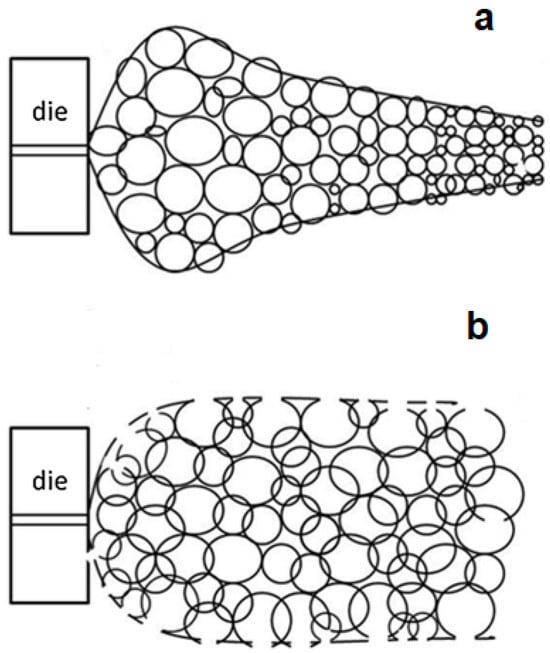 Conventional polymer extrusion is a well-established industrial continuous process used to produce plastics with a defined profile geometry. Extrusion foaming was developed by combining conventional polymer extrusion with a process for dispersing a blowing agent within the melt. The dispersion of a blowing agent within the polymer melt can be achieved by injecting a gas directly into the molten polymer (PBA) or by mixing chemical agents (CBA) that will release the gas during the melting process. However, the use of PBAs (nitrogen or carbon dioxide) is more common [38]. In extrusion foaming, the polymer in the form of pellets is fed into the extruder through the hopper. The blowing agent is either injected at high pressure into the extruder barrel (gaseous PBAs) or is previously mixed with the polymer pellets before the feeding (solid CBAs). The pellets are melted inside the extruder barrel due to the high temperatures and are further mixed with the blowing agent, forming a homogenous mixture of the blowing agent combined with the melted polymer. A representative diagram of the extrusion foaming process is shown in Figure 3.