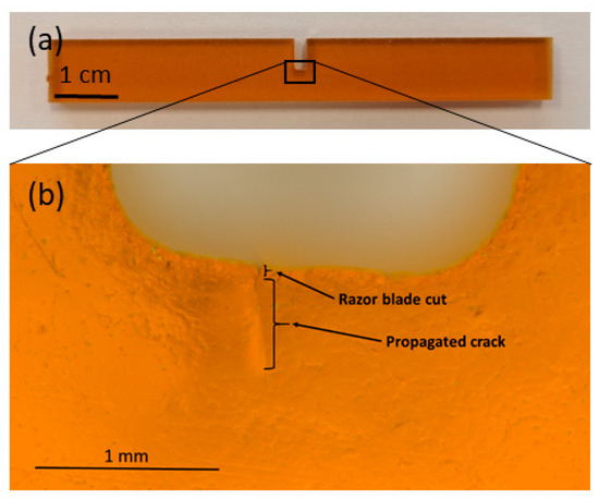 The critical stress-intensity factor (KIC) and the critical energy release rate (GIC) are derived from load–displacement curves measured in three-point bending of single-edge notched bending (SENB) specimens having nominal dimensions of 80 × 10 × 4 mm3. The samples have a 2 mm-wide and 5 mm-deep notch produced by a water jet. In all samples, a fine cut was added with a razor blade. A microscopic image of a typical crack produced with a razor blade in the notch of a CTD101K SENB sample is shown in Figure 1.