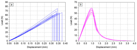 Before the calculation of KIC and GIC, it needs to be verified that the material represents linear elastic behaviour and that the crack propagation is unstable. As an example, load–displacement curves of the SENB samples made of MY750 (Figure 2a) and the corresponding fracture surface indicate linear elastic behaviour with unstable crack propagation. In contrast, the Mix61 load–displacement curves (Figure 2b) and fracture surface are indicative for elastic–plastic deformation with stable crack propagation.