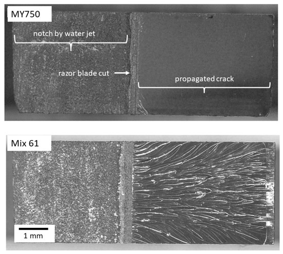 Typical fracture surfaces representing unstable crack propagation (MY750) and stable crack propagation (Mix61) are shown in Figure 3.