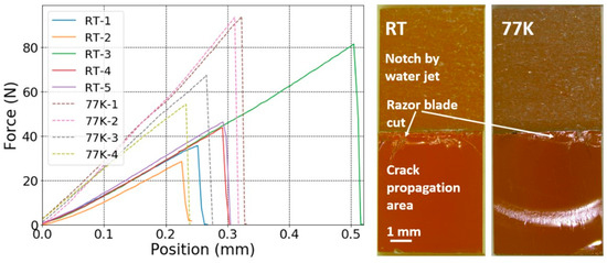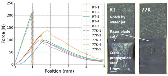 Load–displacement curves of PC specimens (left) and typical fracture surface images (right) at RT and 77 K.