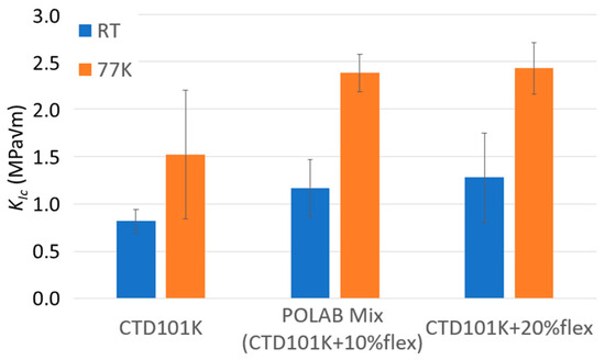 Comparison of the critical stress-intensity factor KIC at RT and 77 K of CTD101K, POLAB Mix (CTD101K+10 wt.% DY040) and CTD101K+20 wt.% DY040. Error bars: ±1σ.