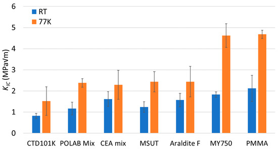 Fracture toughness parameters critical stress-intensity factor (KIC) of CTD101K, POLAB Mix, MY750, CEA mix, MSUT, Araldite F, and PMMA at RT and at 77 K. Error bars: ±1σ.