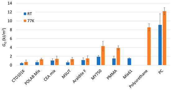 Comparison of critical energy-release rate (GQ) of CTD101K, POLAB Mix, MY750, CEA mix, MSUT, Araldite F, Polyurethane, PMMA, and PC at RT and at 77 K. Error bars: ±1σ.