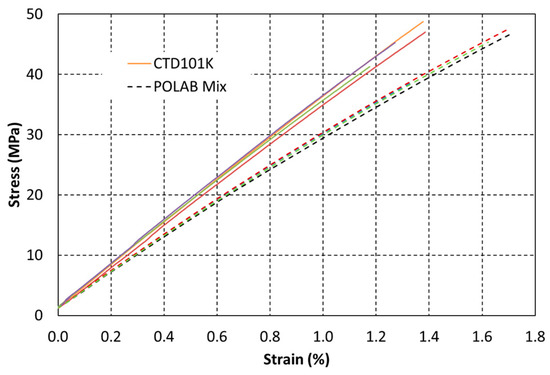 Uniaxial tensile stress–strain curves of CTD101K (continuous lines) and POLAB Mix (dashed lines) acquired at 23 °C according to [37].
