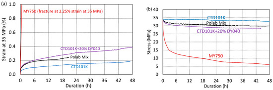 Comparison of CTD101K, POLAB Mix, CTD101K+20 wt.% DY040, and MY750 (a) tensile strain as a function of duration at constant stress of 35 MPa (creep) and (b) tensile stress as a function of duration at constant strain applied at initially 35 MPa (stress relaxation).
