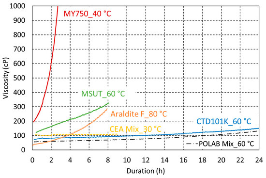 Comparison of the viscosity evolution of CTD101K and POLAB Mix as a function of duration at the processing temperature of 60 °C with the viscosity evolution of CEA Mix at 30 °C, MSUT at 60 °C, Araldite F (without accelerator) at 80 °C, and MY750 at 40 °C.