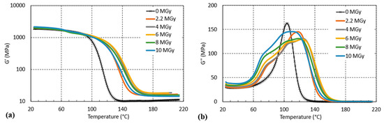 Moreover, a pronounced broadening of the glass transition range as seen in G″ (Figure 12b) and splitting in a lower-temperature branch (shoulder) and a higher-temperature branch (G″ maximum) emphasise this competition. The lower-temperature branch presumably corresponds to a lower crosslink density fraction of the polymer produced by chain scission, whereas the probably crosslinking-induced higher-temperature branch is shifting to higher temperatures, up to a dose of 6 MGy first and shifting to lower temperatures at higher doses.