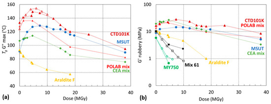 The storage modulus (G′) and loss modulus (G″) were recorded during temperature sweeps with a Dynamical Mechanical Analyser MCR702e from Anton Paar, Graz, Austria. Glass transition temperatures have been derived according to ASTM D 4065, DIN EN ISO 11357 [41,42], at a frequency of 1 Hz and a temperature ramp of 2 K/min. During the temperature sweeps, the thermal expansion of the samples has been measured as described in [23]. Irradiation-induced changes of the rubbery shear modulus (G′rubbery) have been determined as a measure of the molecular weight between the crosslinks and the crosslink density [43,44,45].