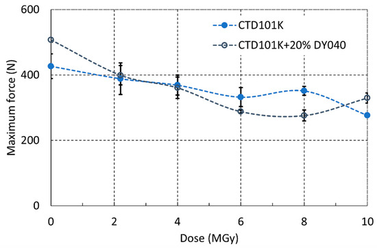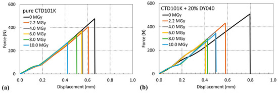 The three-point bending force–displacement results in the short-beam test configuration [48] of the three-component CTD101K and the four-component CTD101K+20%DY040 flexibiliser systems after different gamma doses are compared in Figure 14.