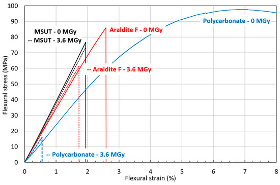 Flexural stress–strain curves of MSUT, Araldite F, and PC before and after irradiation to 3.6 MGy are presented in Figure 16. The epoxy-resin system MSUT shows almost no difference in flexural properties before and after irradiation to 3.6 MGy. The epoxy-resin system Araldite F has a significantly lower flexural strength after irradiation to 3.6 MGy. The thermoplastic PC has outstanding flexural properties in the unirradiated condition but dramatically degrades after irradiation to 3.6 MGy, with a reduction of flexural strain at maximum stress from 6.7% to 0.6%. After 3.6 MGy, PMMA does not keep any mechanical strength.