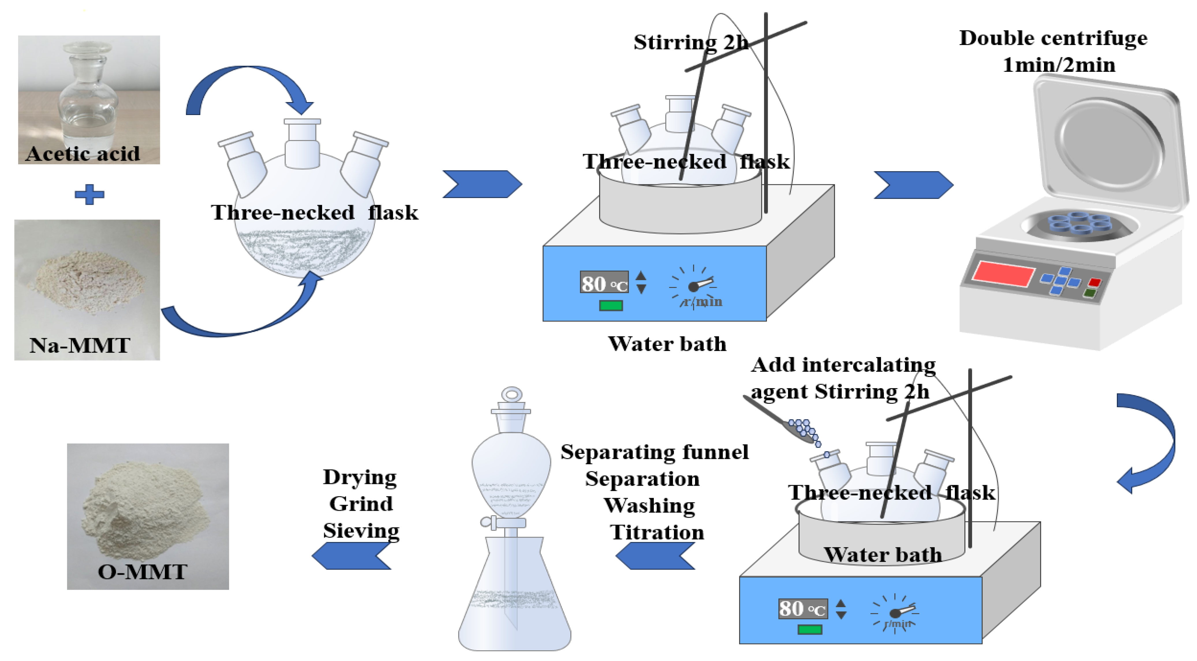 - After being subjected to multiple cycles of standing, washing, filtering, drying, grinding, and sieving processes, the organically modified montmorillonite (O-MMT) was successfully obtained by putting the mixed solution into the separator funnel and allowing it to sit for 24 h.