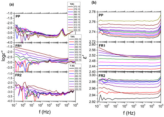 BDS isothermal curves for all temperatures examined with (a) the dielectric losses (logε″) and (b) the real part of permittivity (ε′) over frequency (f). From top to bottom, the isothermal curves refer to: reference PP, FR1, and FR2.