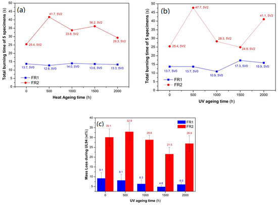 Total burning time for 5 specimens during artificial ageing experiments. (a) Heat ageing at 110 °C for 2000 h, (b) UV weathering for 2000 h, (c) Average mass loss during UL94 test for the UV aged samples.