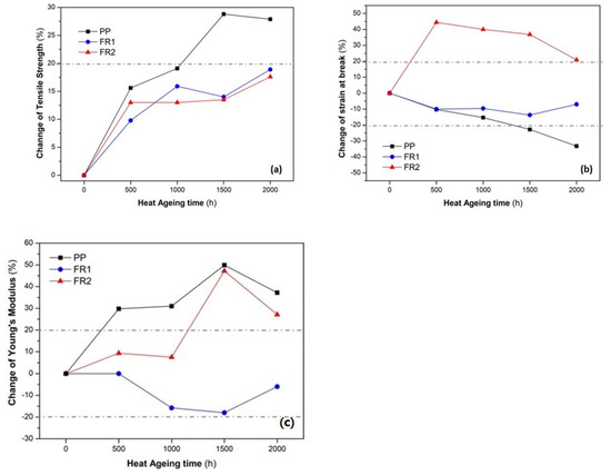 Turning to the mechanical performance during ageing, first, we examined the retention of tensile strength in the heat ageing experiments in order to assess any thermo-oxidative stabilization effect of the FR additives. Typically, polyolefins with increasing ageing time exhibit oxidative degradation triggered by heat and/or UV radiation in the presence of oxygen [15,39,40]. In terms of tensile properties, PP, upon ageing, typically exhibits an increase in the Young’s modulus (E), with a strong reduction in the elongation at break, a behavior well-known as embrittlement [19,48,51,52,53,54]. This was observed clearly for reference PP (Figure 5). Therefore, a tolerance level of ±20% in the change of all three tensile values was arbitrarily selected so as to evaluate the mechanical performance of the FR compounds against heat ageing. Accordingly, the two FR compounds exhibited a more slowly increasing trend of tensile strength (σmax, Figure 5a), ending up at 2000 h at a total deviation in the range of 17–19%. Especially for the initial 500 h, the relative increase in tensile strength can be due to annealing of the polymer [19]. Regarding the strain at break (εmax, Figure 5b) and Young’s modulus (Figure 5c), no clear trend was observed, as anticipated, due to embrittlement: FR1 was quite stable throughout the ageing time, ending up with an insignificant reduction of εmax in the range of ca. 7% and a reduction of 10% for E at 2000 h. FR2, surprisingly, exhibited an increasing trend of εmax from as soon as 500 h, reaching 20% change and a constant increase in E even reaching 47%. It can be concluded that the developed FR compounds exhibited embrittlement during heat ageing, but at much lower extent than reference PP.