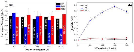 Turning to UV weathering, Izod impact strength was monitored (Figure 6a) in order to simulate the maintenance of PP conduits performance for outdoor applications, since impact is the most critical mechanical property for such products. Already, reference PP exhibited a stable behavior of impact strength during the weathering process [19,47,51,52,53,54], with all measured specimens again not being broken during the impact test. On the contrary, FR1, at 500 h, exhibited a strong decrease of ca. 44%, which, at 1000 and 1500 h, increased again close to the initial value and at ended up at 2000 h with a 50% total decrease. The standard deviation values are also high (18–65.5%) vs. ageing time, which is again an indication of poor additives dispersion or phase separation in the compounded material (FR1). In addition, all FR1 specimens broke during the impact tests. Therefore, it is not easy to accurately determine the effect of ageing on impact strength; nevertheless, it is obvious that FR1 shows impact strength deterioration, probably due to ADD1 partial hydrolysis as mentioned above. In contrast to FR1, FR2 exhibits a very similar behavior to reference PP (all aged specimens remained unbroken during the test) with impact strength maintenance throughout the UV weathering time. Moreover, impact specimens were weighed prior to and after each ageing interval and the mass gain due to humidity (water uptake, Figure 6b) was calculated. Accordingly, FR2 exhibited very low water uptake, similar to PP, as expected, since PP is not considered as hygroscopic material. On the contrary, FR1 showed a much higher water uptake, which increased with UV-ageing time, proving the interaction of ADD1 with humidity and indirectly verifying the partial hydrolysis that the pertinent additive suffered.