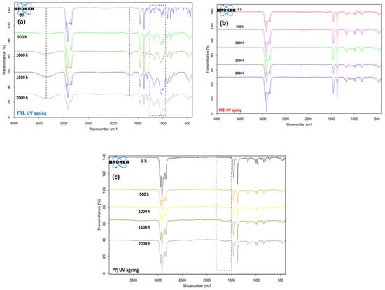 FT-IR ATR spectra of FR compounds (a,b) and reference PP (c) during UV ageing. Dashed lines highlight the changes in the spectra as a consequence of ageing.