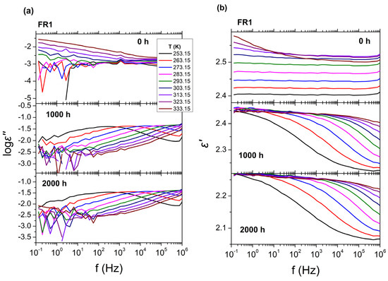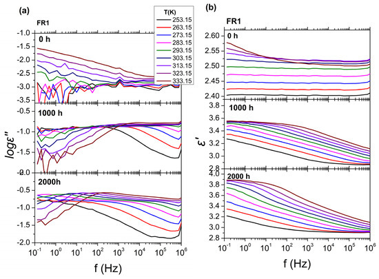 BDS isothermal curves of FR1 after UV ageing for all temperatures examined, with (a), the dielectric losses (logε″) and (b)the real part of permittivity (ε′) over frequency (f). From top to bottom for each graph, the isothermal curves refer to different ageing times: 0 h, 1000 h, and 2000 h.
