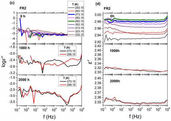 The BDS results for FR1 and FR2 after heat ageing at 110 °C for 0, 1000 and 2000 h are presented in Figure 8, in the form of isothermal curves of the dielectric permittivity (ε′) and dielectric losses (logε″) over frequency (f), for all temperatures examined. As was mentioned before, in the absence of thermal ageing (0 h), FR1 and FR2 show extremely low values of dielectric losses (logε″); thus, their dielectric behavior cannot be further discussed. In the case of FR1, thermal ageing leads to major changes in the dielectric spectra (Figure 8a,b). After thermal treatment for 1000 h (40 days) at 110 °C, dielectric loss values increase at all examined temperatures (ε″~10−2) and two relaxation processes can be observed in the dielectric loss spectra (Figure 8a). The fast one corresponds to α process, related to Tg, and the slower one corresponds to an Arrhenius-like process related with the presence of additives in the polymeric matrix of PP. After thermal treatment for 2000 h (80 days), the two processes become more distinct, with the dielectric losses increasing to even higher values (ε″~10−1). These changes can also be observed at the dielectric permittivity curves (Figure 8b), where there is a gradual increase of dielectric permittivity (ε′) with increasing ageing time, for all temperatures examined, with a value of ε′~3.4 for 1000 h and ε′~3.6 for 2000 h. On the other hand, in the case of FR2 (Figure 8c,d), thermal ageing for 1000 and 2000 h does not have any significant effect on the dielectric spectra. Dielectric loss values for both ageing times remain very low at all temperatures studied, making the analysis of the dielectric loss spectra using the HN equations meaningless. For that reason, in Figure 8c,d, the dielectric response at only two indicative temperatures is shown. In terms of dielectric permittivity, a small drop can be observed (ε′~2.35) for both 40 and 80 days, at temperatures T = 273 K and T = 298 K.