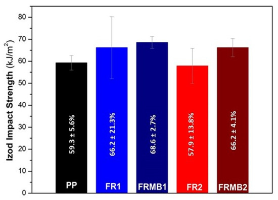From the received MBs, FR1 and FR2 were reproduced, but by blending with the appropriate amount of reference PP in the twin-screw extruder, resulting in FRMB1 and FRMB2 (Table 2). This was performed in order to verify the efficiency of the produced MBs. UL94 bars were prepared by compression molding and the UL94 test was repeated. For FRMB1, the V0 class was reached, with a total burning time for five specimens determined at 13.3 s and an average mass loss per specimen due to dripping at 9.2 wt.%, very close to the respective FR1 (13.7 s and 9.1 wt.%). Similarly, in the case of FRMB2, the V2 class was reached, with a total burning time at 29.8 s and mass loss due to dripping at 23.3 wt.%, again very close to the respective initial FR2 values (25.4 s and 29.2 wt.%, respectively). Moreover, impact specimens of FRMB1 and FRMB2 were prepared so as to evaluate the homogeneity of the compounds developed via the MBs. Indeed, as observed in Figure 10, the compounds developed from the MBs show slightly higher average impact strength, but, meanwhile, a much lower standard deviation, which verifies that the dilution from the MBs ensures a better and more homogenous dispersion of the FR additives. Indicatively, the RSD values for FRMB1 and FRMB2 are 2.7% and 4.9%, respectively, much lower than the ones given in Table S2.