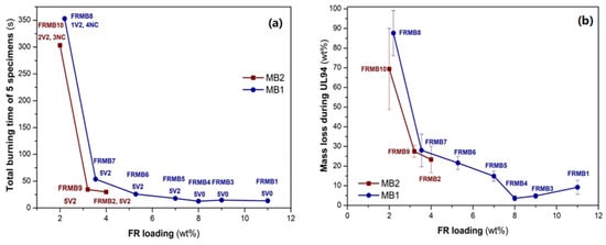 (a) Total burning times as a function of FR loading for different formulations developed from the industrial masterbatches (MB1, MB2) (b) Average mass loss per specimen during dripping in the UL94 test.