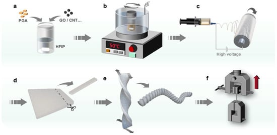 Schematic of fabrication of PGA/GO and PGA/CNT nanocomposite yarns. (a) Weighing the raw materials; (b) preparation of solutions for electrospinning via heating and stirring; (c) electrospinning of the nanofibers; (d) cutting the nanofiber films into strips; (e) twisting the strips into nanocomposite yarns; (f) evaluating the tensile properties of the yarns.