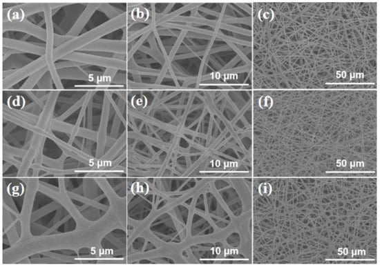 Typical SEM images of electrospun nanofibers. (a–c) pure PGA; (d–f) PGA:GO = 99:1 in wt:wt; (g–i) PGA:GO = 97:3 in wt:wt.