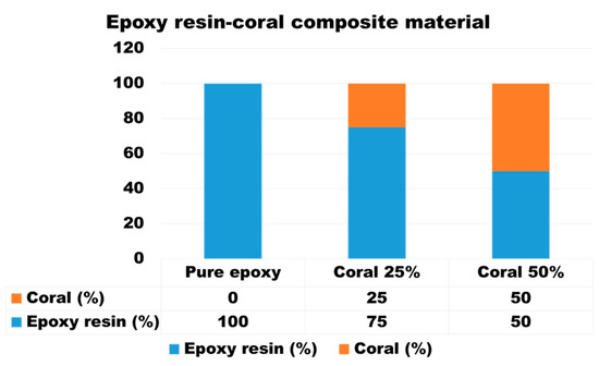 The preparation of the epoxy–resin matrix involved combining the epoxy resin with the hardener in accordance with the manufacturer’s specified guidelines. The required amounts of epoxy resin and hardener were precisely measured using a calibrated scale, adhering to the recommended 2:1 ratio by weight or volume. The necessary quantities of coral powder to achieve weight fractions of 0%, 25%, and 50% were calculated relative to the composite’s total weight, as illustrated in Figure 2.
